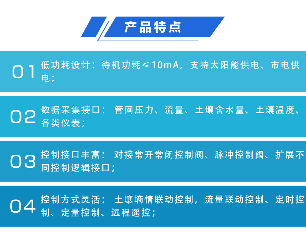 WH-WCK6型物联网智能灌溉终端终端利用物联网、LoRa无线组网、自动化技术,适合大面积灌溉、多点控制阀布局、不方便供电、不方便主控通讯的应用场景。产品通过土壤、气象、作物等类传感器实时采集田间土壤墒情、管网压力、流量等监测数据无线发送到灌溉主控系统汇集的数值进行分析后由‘物联网智能灌溉终端’执行命令动作,以此来实现灌溉自动化控制运行环境。