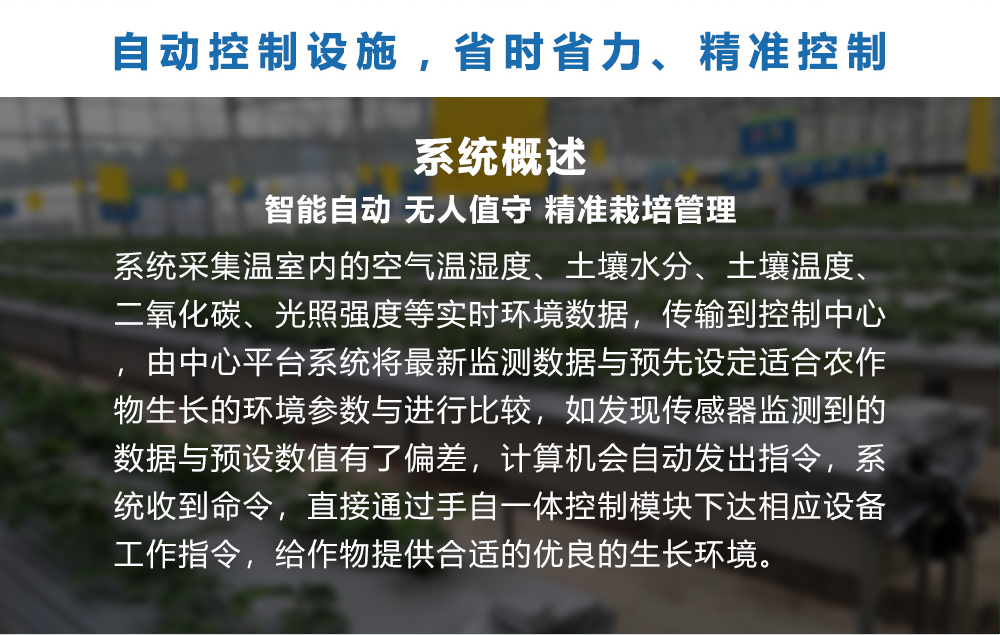 系统通过先进的远程工业自动化控制技术,让用户足不出户远程控制温室设 备。可以自定义规则,让整个温室设备随环境参数变化自动控制。比如光照强 度过高时,自动关闭遮阳降低光照强度。客户可以通过手机在任意地点远程 控制温室的所有设备。