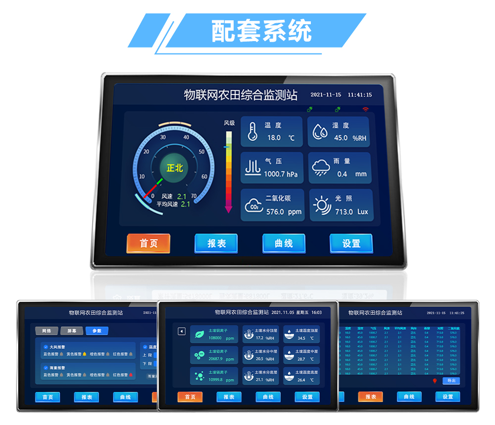便携式物联网农田综合监测站是我公司专门针对农田草场园林等局部小尺度环境专门设计的,对农田农作物等植被环境气候生长密切相关的土壤、气象等环境参数监测的综合气象站。便携式物联网农田综合监测站将温度、湿度、气压、风向、风速、雨量、土壤温湿度、土壤PH、土壤EC、土壤铜离子、土壤铅离子、土壤镉离子等监测结合可以在同一时间观测到各项数据变化。